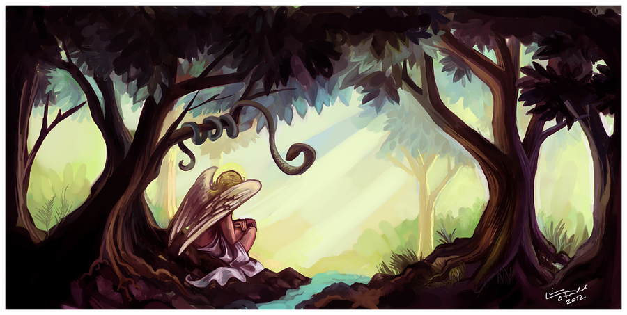 Szavait minden bizonnyal annak az angyalnak intézte, aki az általa keletkezet lyuk előtt lebeget. Elég valószínű volt, hogy angyal, hiszen úgy nézet ki, mintha a bibliából lépett volna elő. Karcsú, márvány bőrű, vállát söprő, enyhén hullámos arany fürtökkel és halványkék szemekkel. Szárnyai hatalmasak és hófehérek, selymesnek tűnő tollakkal borítva. Kezében kétélű, lángoló kard. Ő egyszerű, fehér tógaszerűséget viselt, derekán bőr övvel.