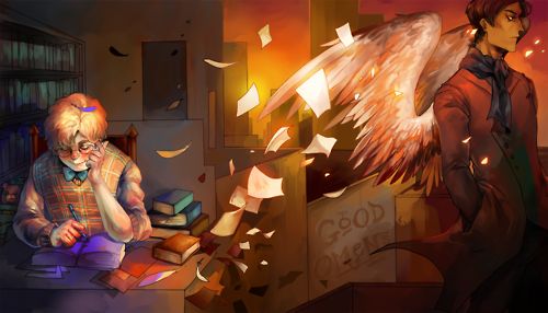 Ryan, viszont hozzá látott, hogy helyre hozza. Óvatosan nyúlt, a bőrszerű szárnyhoz, de kellemesen csalódott, mikor annak tapintása jobban hasonlított a kígyók száraz pikkelyéhez, mint bőrhöz. Az első érintésre a démon felnyögött a fájdalomtól, de rögtön intett, hogy semmi baj. Aziraphale közelebb lépet bűnbánó arccal, és bíztatóan Crowley vállára tette a kezét.